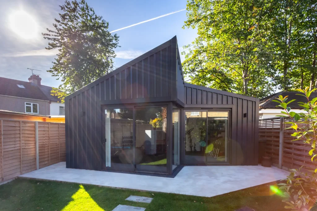 The design of the new structure was strictly guided by the permit development guidelines, including the height of the ridge and eaves, as well as the building’s length. These were our fixed starting points. However, the design drew inspiration from the recently completed extension. To create a cohesive architectural language, we replicated the sharp angles and tilted façades, along with zinc façade accents, establishing synergy between the newly extended house and the new building.