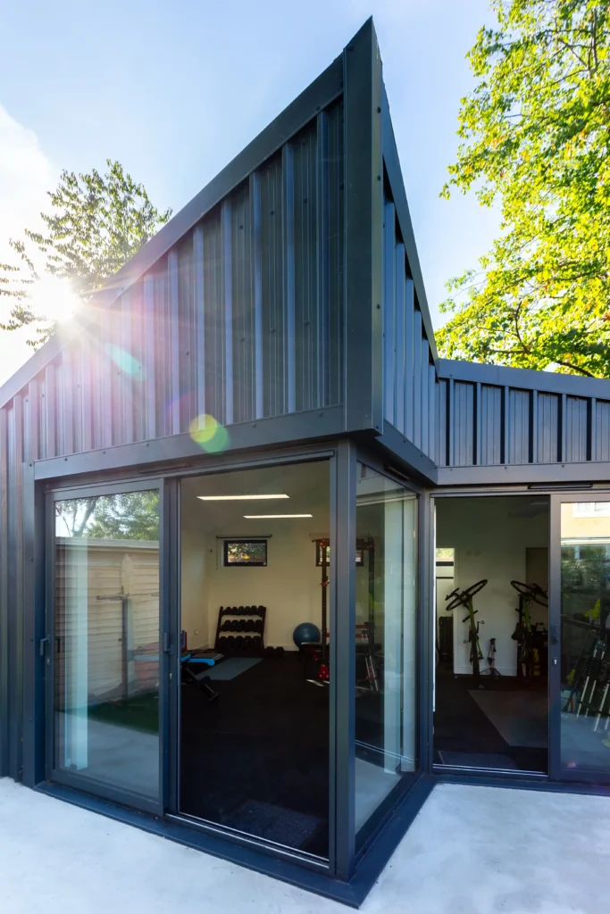 Initially, they had an outbuilding at the back of the garden, so the first approach was to remodel the existing structure to suit their needs. The brief was for a spacious gym that could accommodate weight benches and lifting equipment, a cardio area, space for bicycles, and a ventilated storage area for scuba diving equipment.
