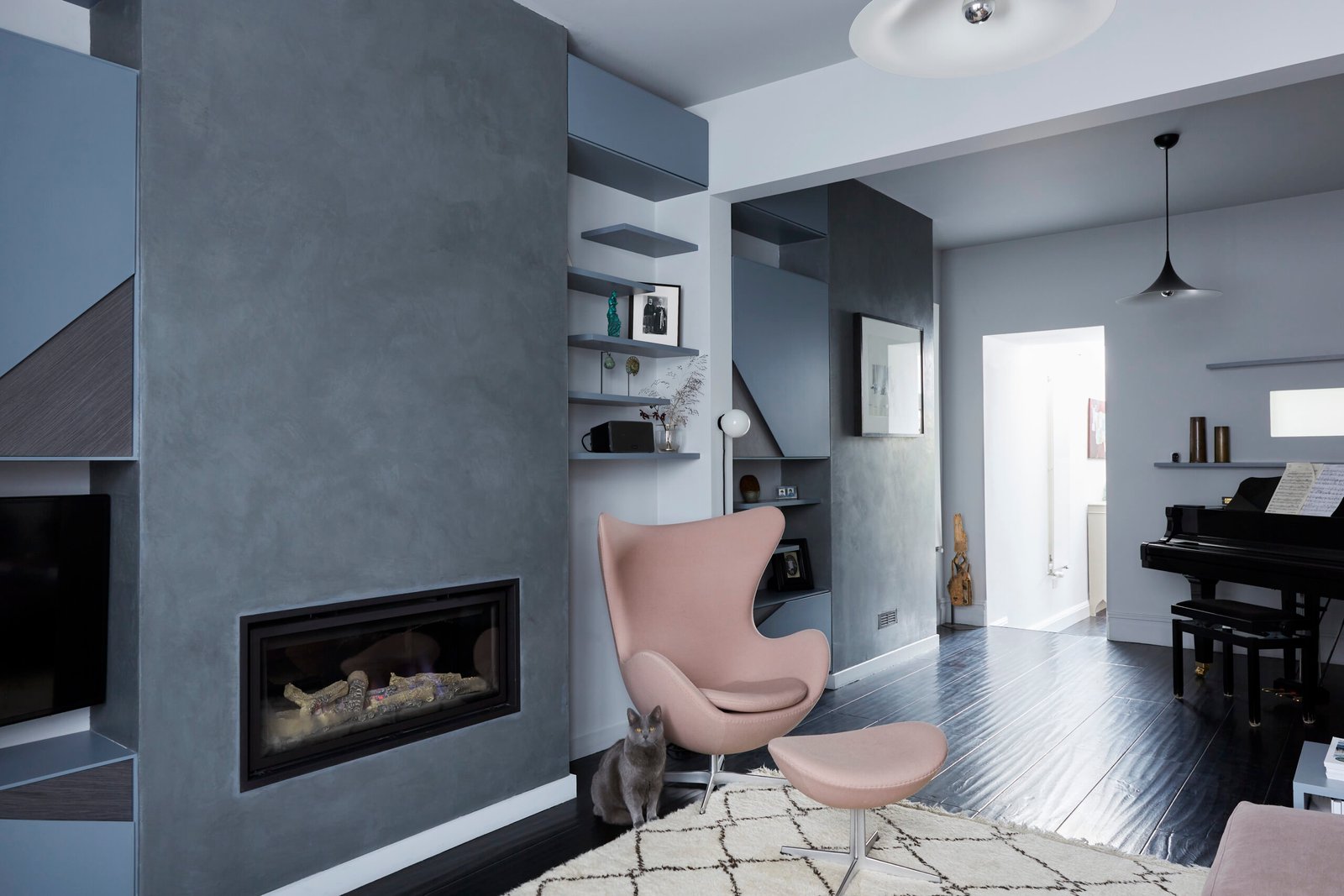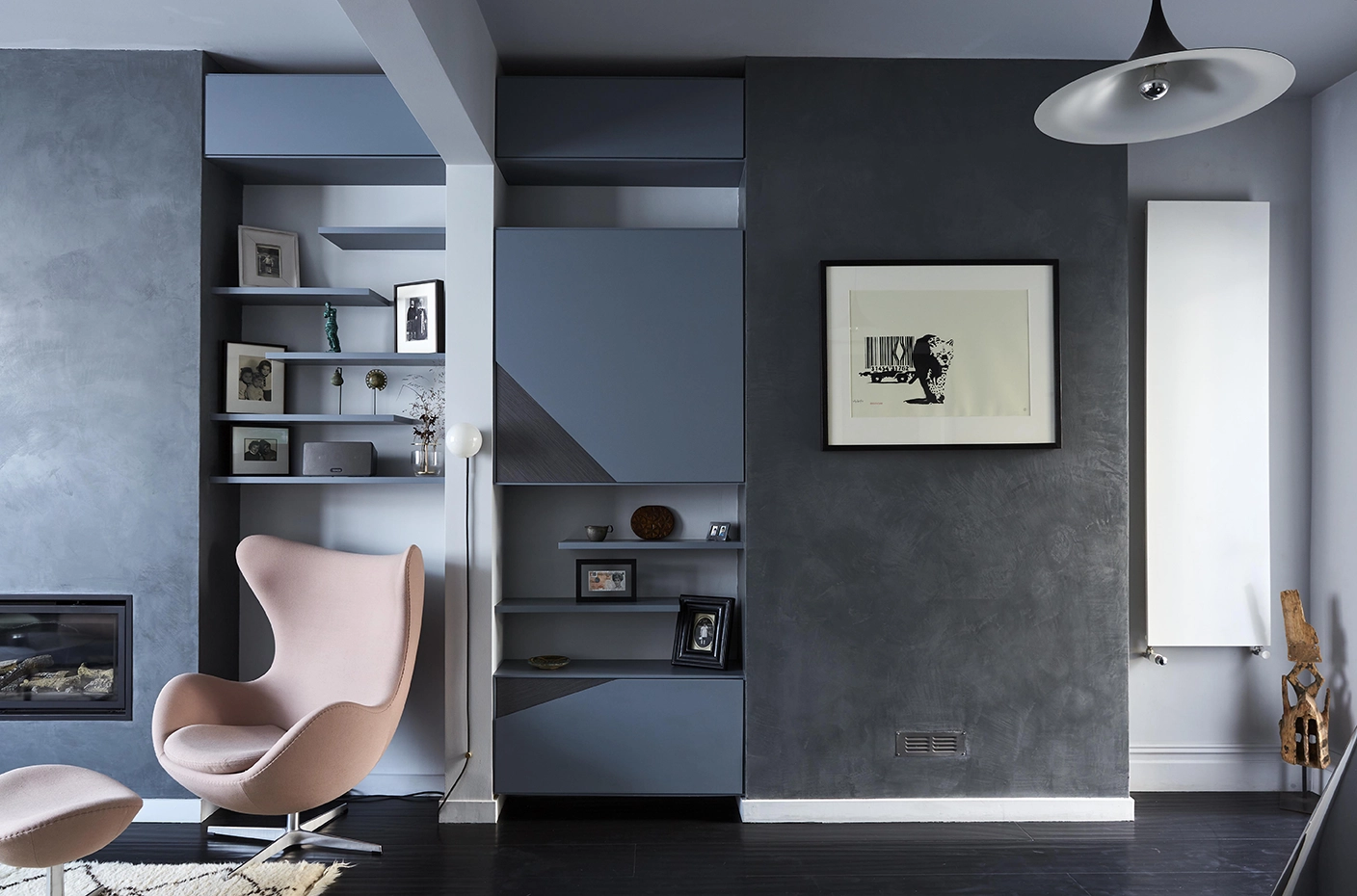 In the living room, the straight lines and sharp corners of the bespoke shelves balance with period features. Flat hues dress the walls, ceiling and mouldings without hierarchy or accents. The new features are the accents: Tadelakt, the bookcase with reclaimed wooden handles and the contemporary fireplace.