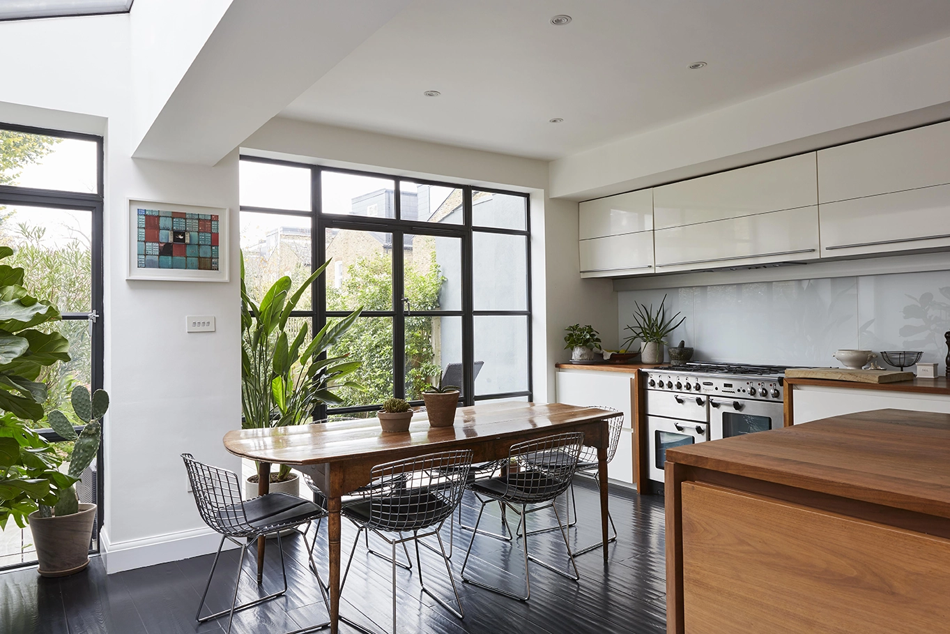 Light flows from the adjacent kitchen and the full length skylight over the side extension.
