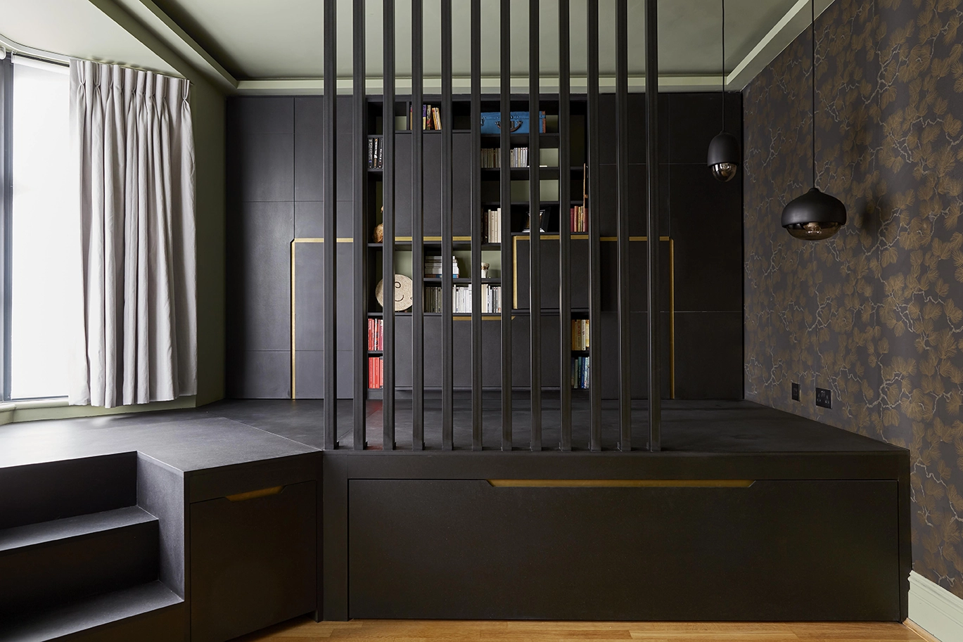 A darker colour palette was picked for this room, we chose black tinted MDF (Valcromat) brightened by bronze inlays and papered wall.